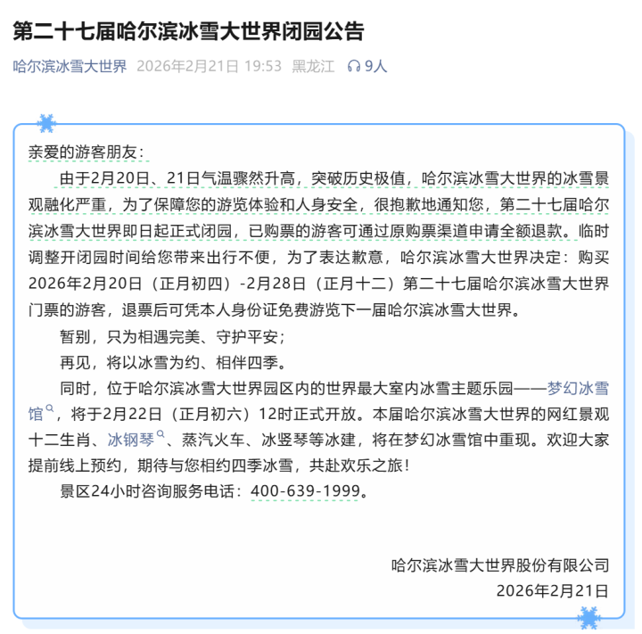 由于2月20日、21日气温骤然升高,突破历史极值,哈尔滨冰雪大世界的冰雪景观融化严重,为了保障您的游览体验和人身安全,很抱歉地通知您,第二十七届哈尔滨冰雪大世界即日起正式闭园,已购票的游客可通过原购票渠道申请全额退款。临时调整开闭园时间给您带来出行不便,为了表达歉意,哈尔滨冰雪大世界决定:购买2026年2月20日(正月初四)-2月28日(正月十二)第二十七届哈尔滨冰雪大世界门票的游客,退票后可凭本人身份证免费游览下一届哈尔滨冰雪大世界。